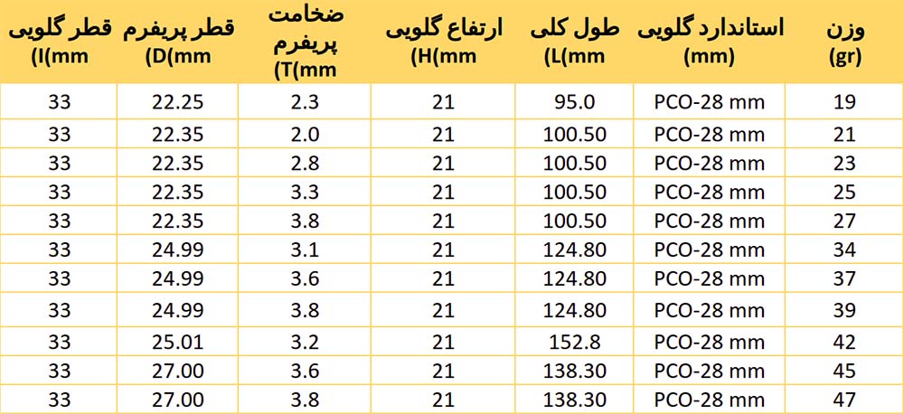 این شرکت هم اکنون با سه خط تولید پریفرم، سالانه به تولید 5.000 تن پریفرم در اوزان مختلف می پردازد. جدول اوزان و مشخصات دقیق پریفرم ها در ادامه آمده است: